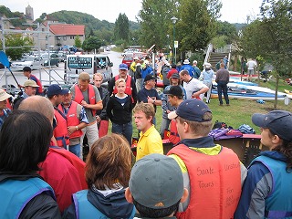 まずは挨拶、みなさんこんにちは、ってなことをいっておりました。 この日は天気が悪いにもかかわらず、同じカヌーレンタル屋さんから借りているひとは少なくとも20人はいたと思います。 初めてのひともいたかもしれませんが、皆なれた様子でカヌーにたいりょうのビールを積み込んでいました。