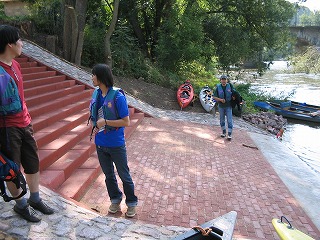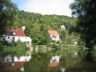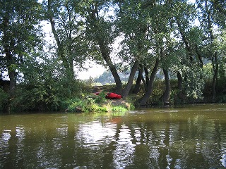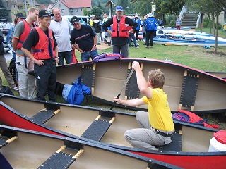 当日の朝からの天気はよいとはいえない曇り空、夜中に雨がずいぶん降っていたかのようでした。参加人員数はFhiを入れて6人になりました。まずはこの町から参加者との待ち合わせ場所の中央駅へ7時45分集合しました。みな時間通りに集まっており、切符を購入後8時01分発のRBで出発し、8時20分に隣町からの参加者2人と合流し目指すはNaumburg! 電車は遅れることなく到着。と、ここでカヌーを借りる場所の住所を忘れてきました。。。。でも、タクシーにのり、運転手に行き先を告げるとそんなに離れていないらしく、すぐに連れて行ってきました。さて、気になる天候は。。。。雨が降り出しました。。。。