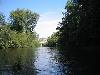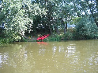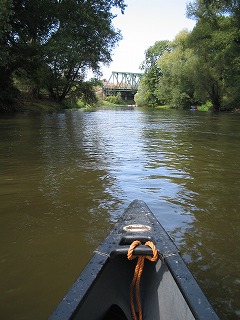 と、順調に進み、ビールの酔いで気分も上々、と、二台のカヌーをくっつけたり、はなれたりして遊んでいたのですが、前方に折れて川に倒れかかったすこし大きめの木を発見。川幅の半分ぐらいを覆ってしまっておりました。 引き続きの実況中継は、脳内の声を脳内の色でお送りいたします。 キャプテーン! 前方に未確認危険地帯がー おもかじいっぱーい 緊急たいひー うわー、よけきれませーん いたそー えー