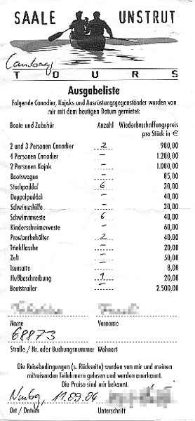 そして、毎度のごとく苗字と名前が逆に記入されていました。 一番上がカヌーをなくした又は壊した場合。900EUR。 これらすべて込みのこのカヌーの川くだり、気になる価格は、一人26EUR!これは安いと思うのですが、いかがでしょうか?